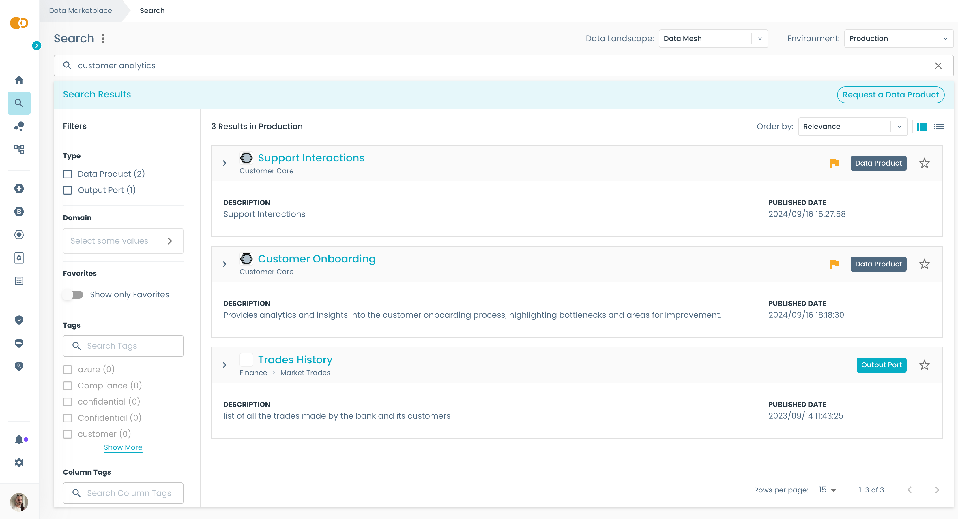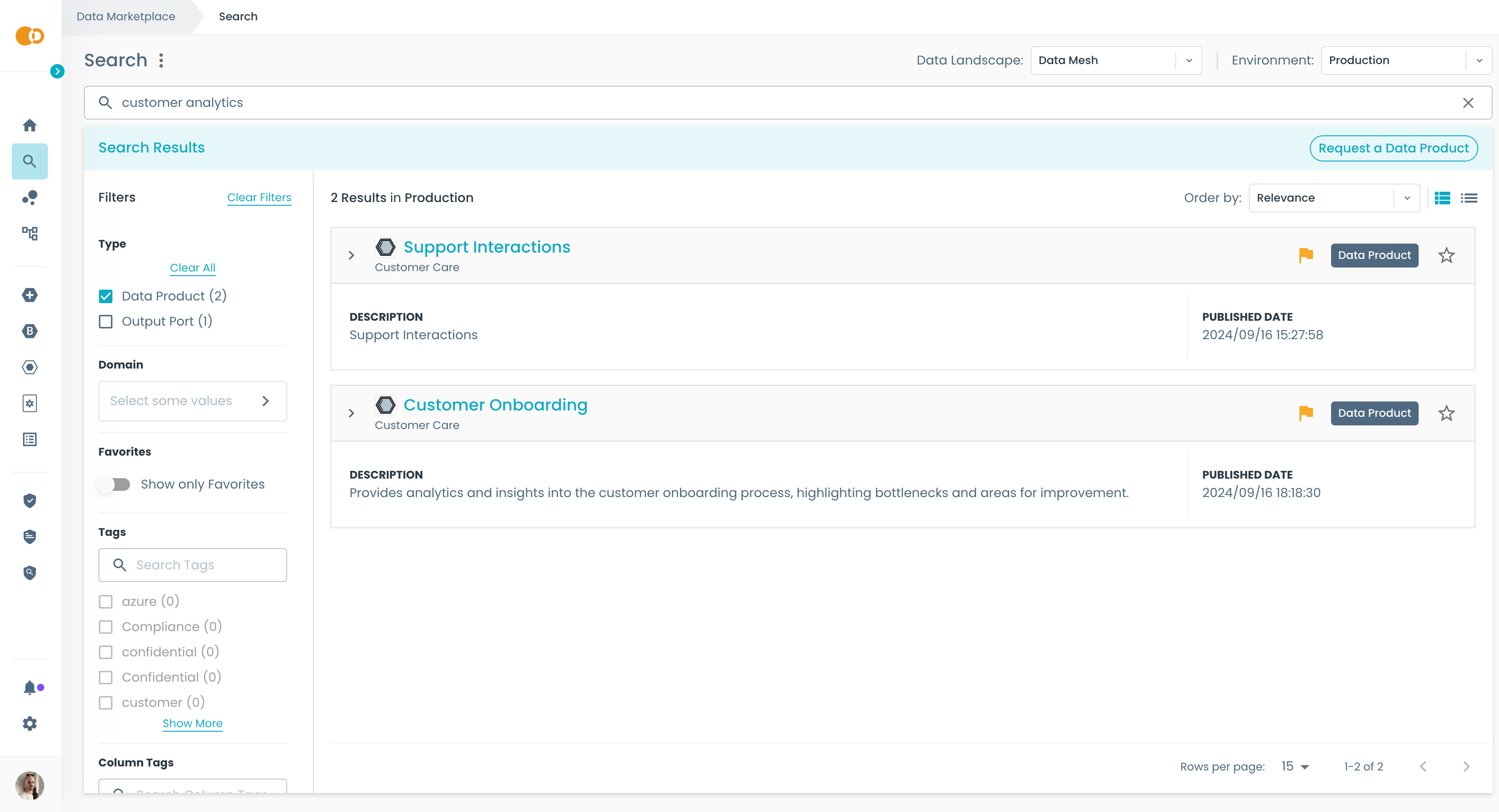 We are now looking at products that are in the Data Mesh landscape and published in the Production environment. At the top right corner you can select a different landscape and environment.