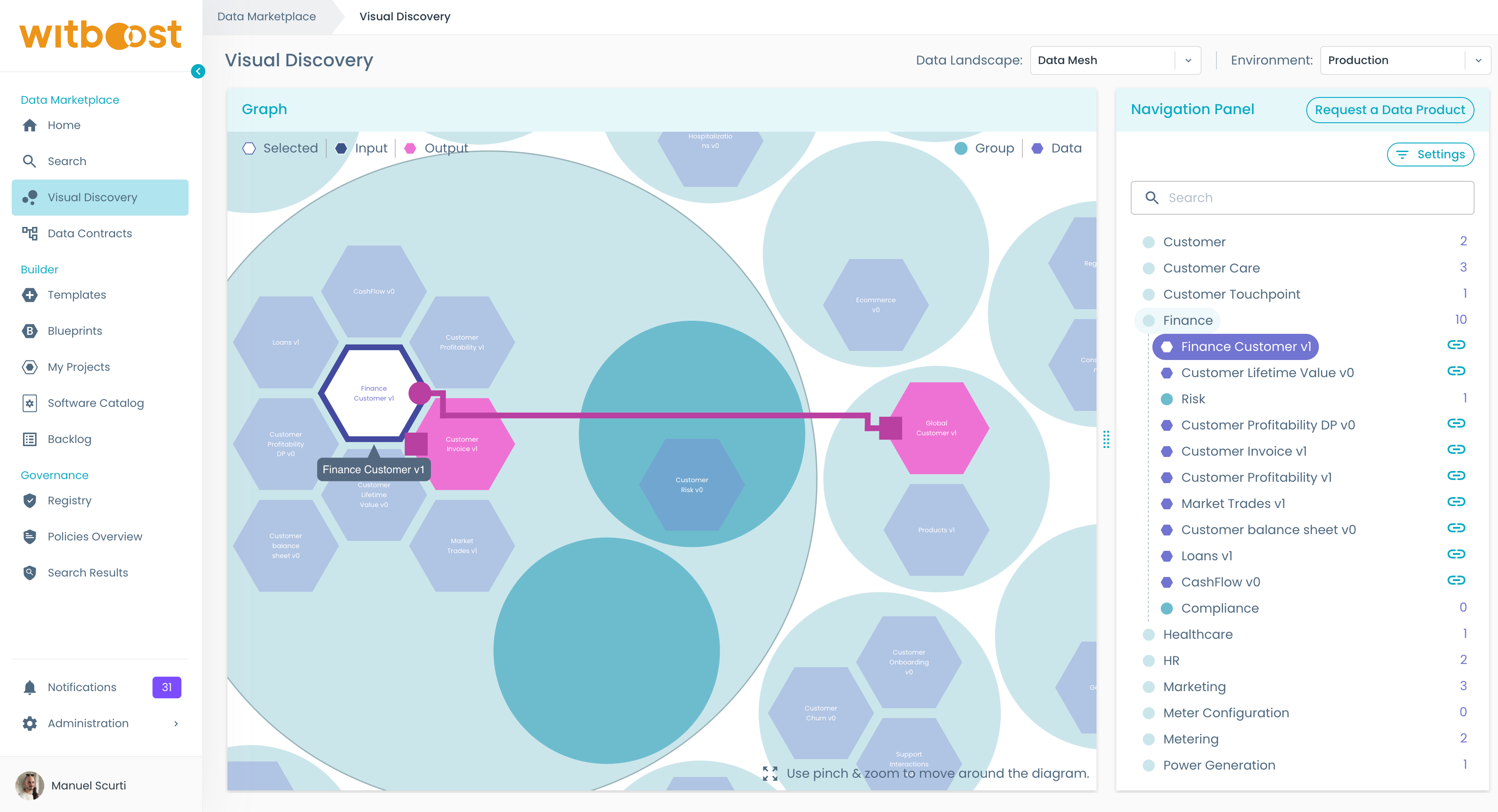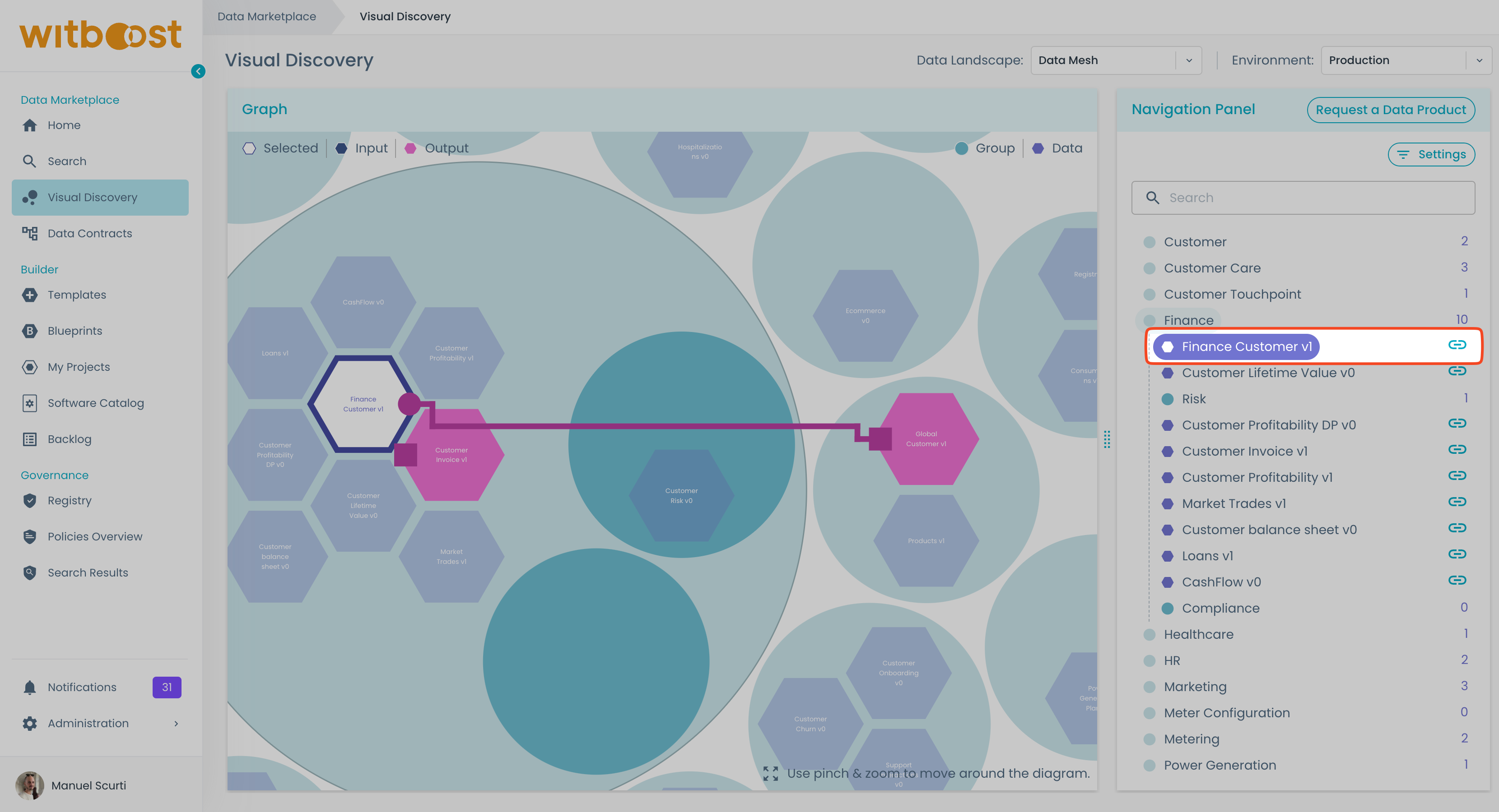 - We want to get more information about the Finance Customer v1 product, so we click on the hexagon.