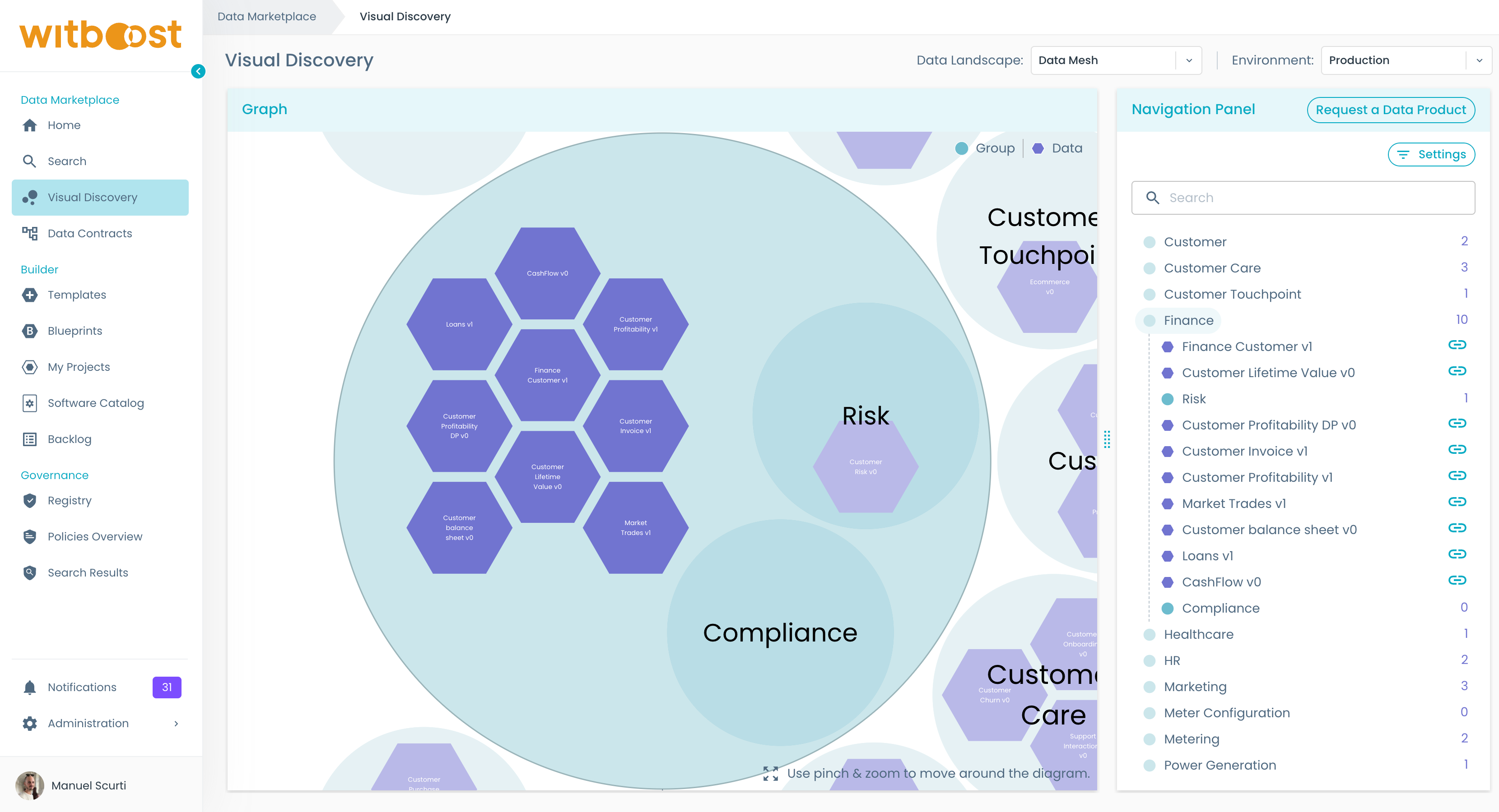 - Look around for the domain you are interested into. In this example, we want to take a look at products published by the Finance business domain. To zoom in, click on the Finance bubble.